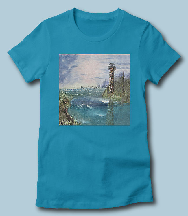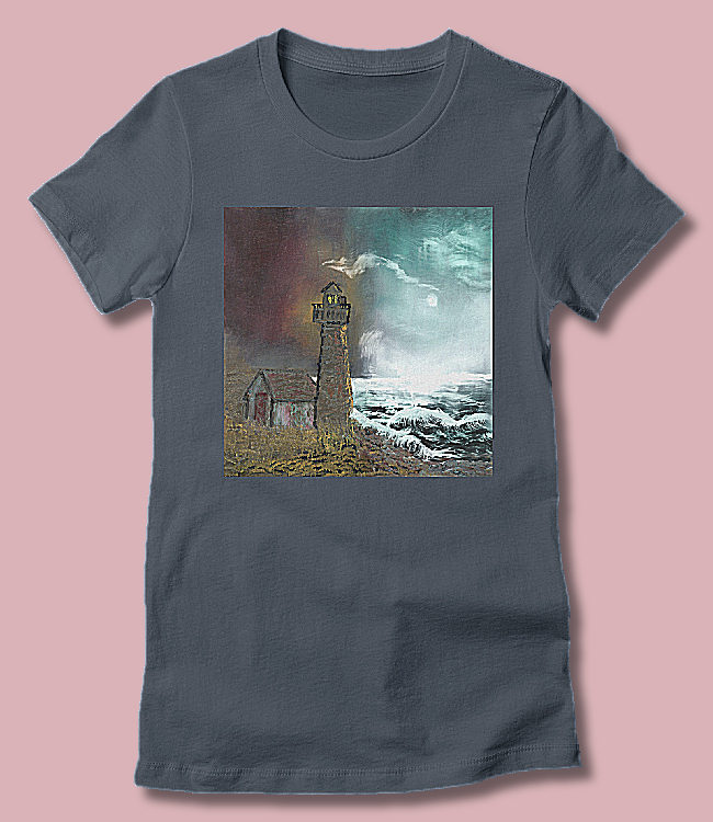 This lighthouse by the sea, illuminating the subtly glowing night, is a reproduction of the first oil painting by Sondra London, completed in September of 2021.