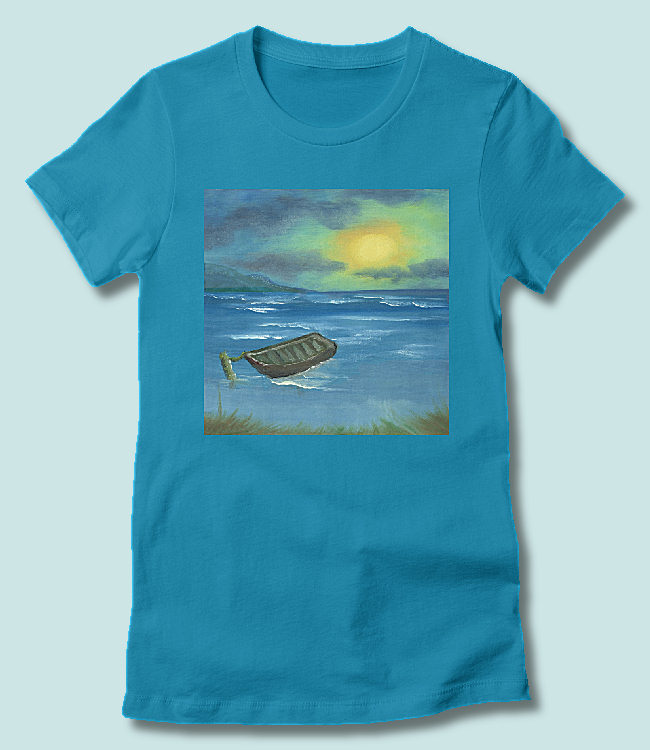 Our trusty little wooden rowboat is tethered in shallow water. On this lovely clear sunshiny day, she is waiting for us to bring our picnic and row her to our secluded inlet for an intimate rendezvous. This seascape is a reproduction of an original oil painting by Sondra London.
